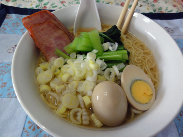 だしの美味しさを確認したかったので、スープに肉や野菜のうま味が入らないよう、シンプルに茹でた。一方、別に小松菜を茹で、スーパーで買ってきた焼き豚や煮玉子、そして刻んだネギと共にトッピングした。