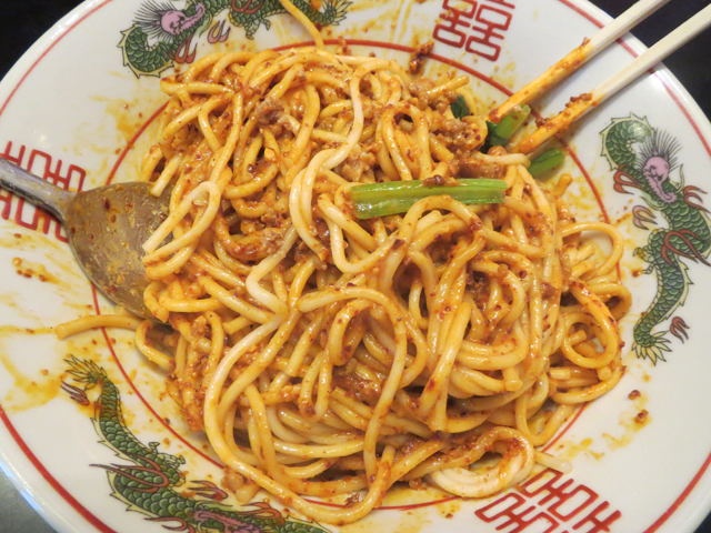 スパゲティーニのような細くモチモチとした麺に、特製のタレや挽き肉、ナッツを和えて食べる。辛さは普通をお願いしたが、スッと辛さが口に広がる。だが、刺さるよな痛みを伴う暴力的な辛さではない。おいしくて、すぐに平らげてしまった。辛さが口の中に残っているので、水を飲んだ。だが水をお代わりするほどではなかった。