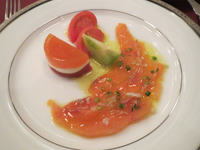 最初の料理は「時鮭のマリネと トマトのムース・ガトー仕立て」で、とろけるような時鮭の食感と、深い味わいのトマトのムースが絶品だった。