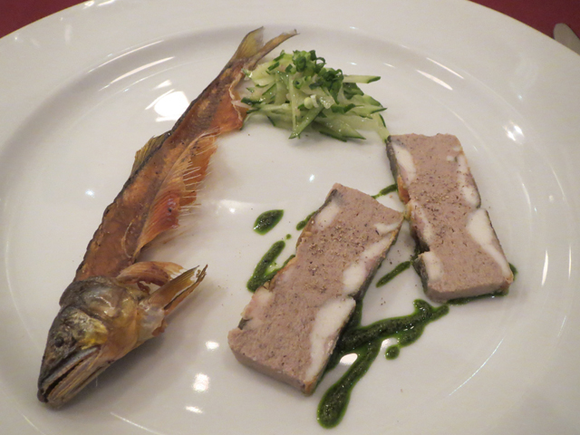 そして2品目が「鮎のテリーヌ キュウリのサラダ添え」。魚料理なので白ワインといきたいところだが、敢えて焼酎のロックにした。これがなかなか相性が良くて、鮎のテリーヌの苦味と辛口の焼酎が合う。身を落とした鮎は、骨ごと揚げて添えられていたが、これがまた焼酎にピッタリで、フレンチに来たのに居酒屋のような気分だった。