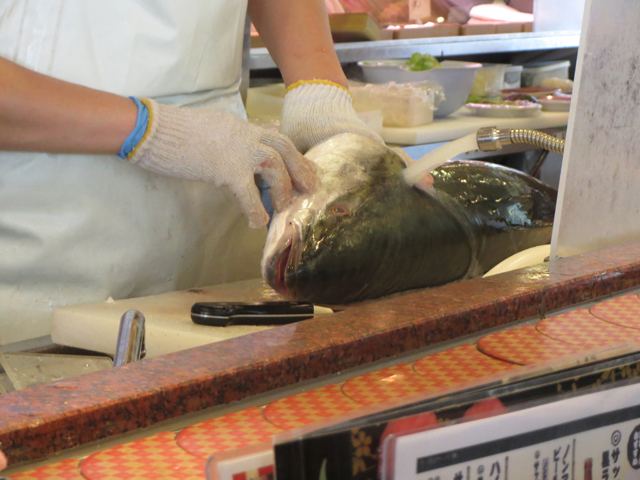 おなかが一杯になりかけたとき、目の前でブリが捌かれ始めた。脂が乗っておいしそうだ。ブリはすでに食べたにもかかわらず、捌きたてを注文した。予想通り、脂が乗っておいしかった。