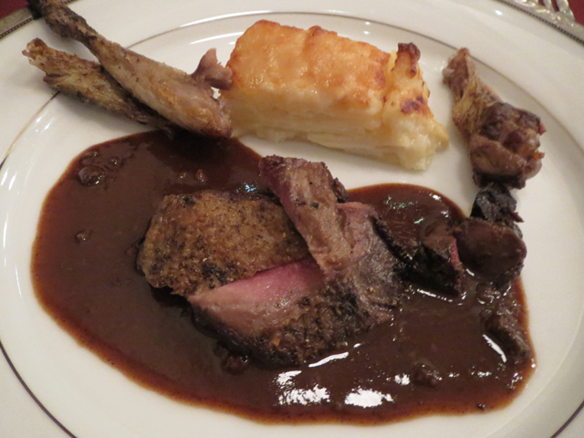 雷鳥のローストは苦味とコクのある大人の味だった。散弾銃の玉が残ってることがあるので気をつけてください、というマダムの説明を聞きながら食べてたら、当たった! 夫婦ふたりとも、散弾銃の小さな玉が出てきた。何となく嬉しい感じ。
