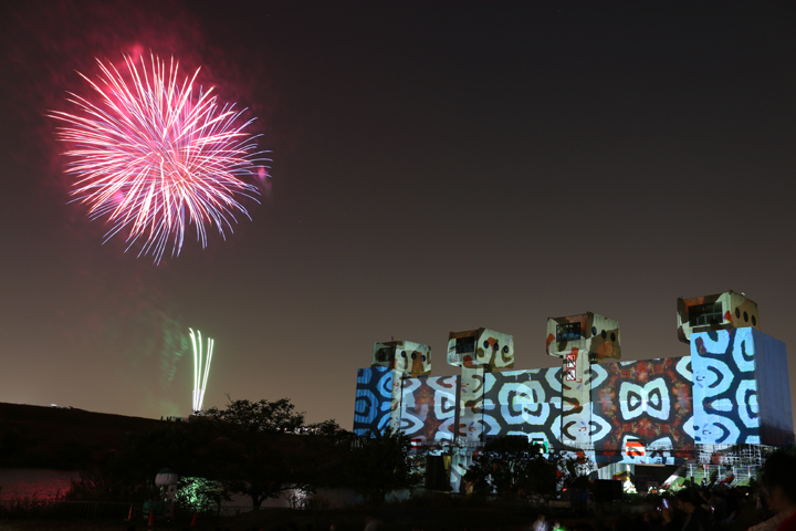 ユニークなのは「デジタル掛軸」と称して、岩淵水門にプロジェクションマッピングでさまざまパターンの模様を映し出すことで、花火の美しさと相まって幻想的な雰囲気を作り出していた。