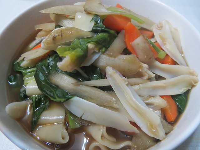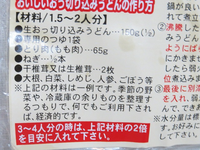 夜は、冷蔵庫の整理も兼ねておっ切り込みうどんを作った。うどんの説明書きに「冷蔵庫の余りものを整理するつもりで、何でもご利用下されば、経済的です。」とわざわざ書いてあった。余計なお世話じゃ(笑)