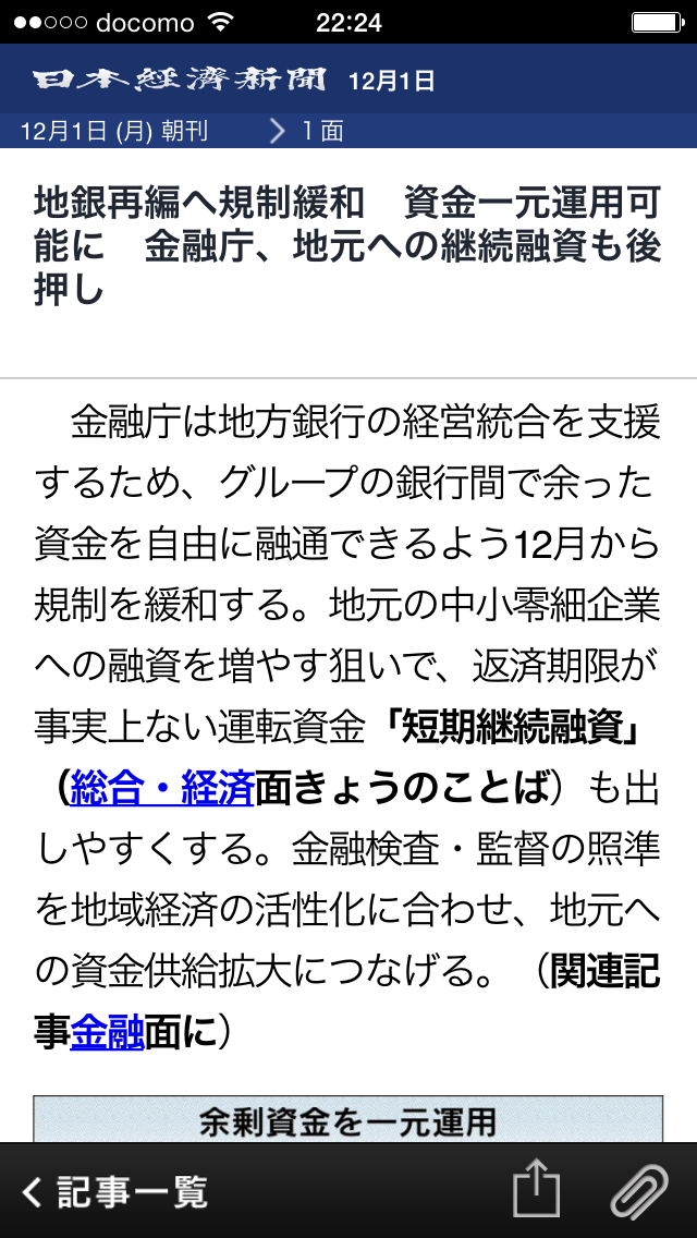 だが、会社からiPhoneが支給されたこともあり、iPhoneで見ることにした。iPhoneには、前述のiPhone番「紙面ビューアー」の他に、「日本経済新聞 電子版」がある。こちらはスマホに最適化されていて、Web記事のように読める。