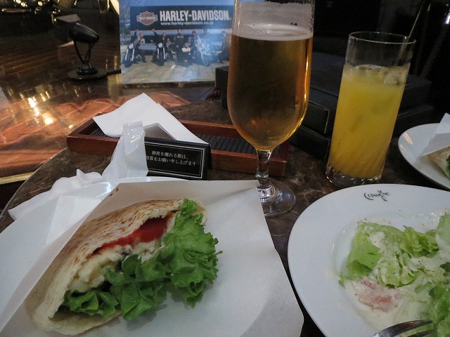 1階のフロアでは、中央の大きなスクリーンで永ちゃんのライブビデオを観ながら食事ができる。食事はいわゆる“ボッタクリ”価格ではなく、プレモルとポテトのピタサンド、持ち帰りできるオリジナルのお皿がついて1800円と、むしろ安いくらい。サイドディッシュで注文したシーザーサラダも、ハーフサイズだが2人で食べるには十分な量で、おいしかった。