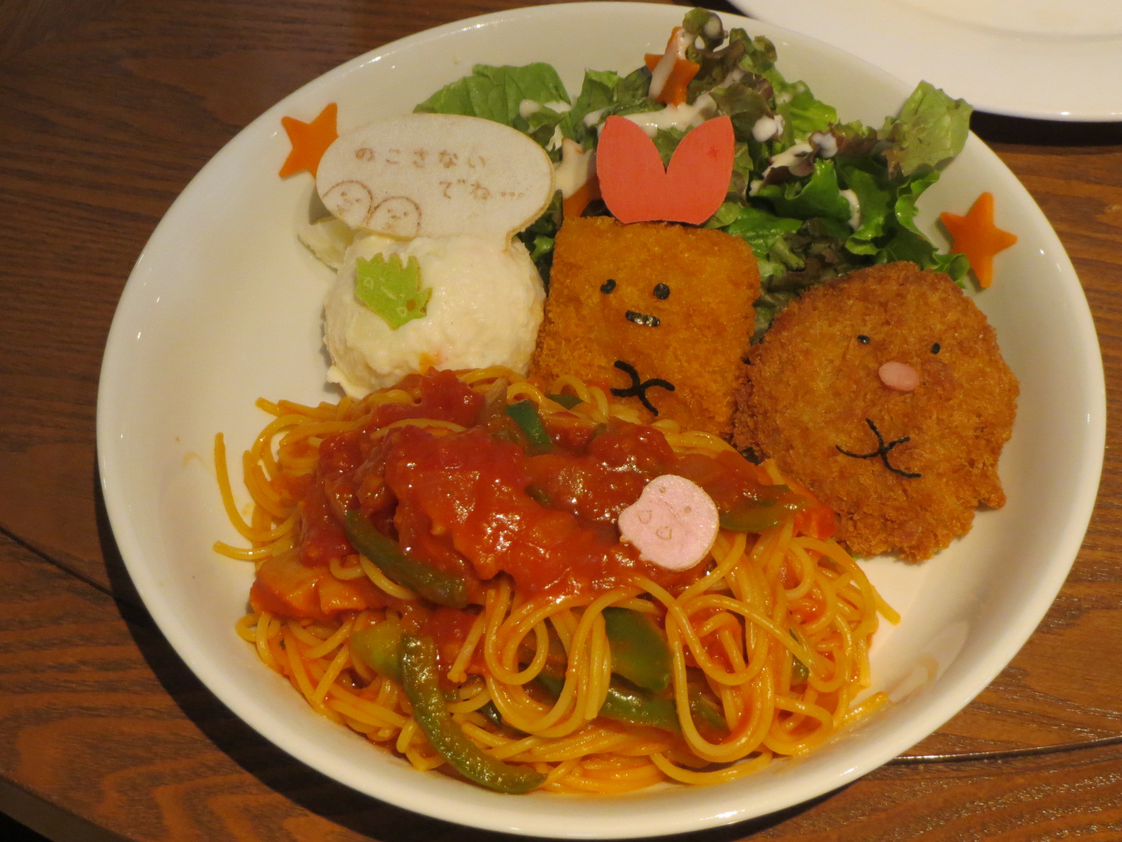 案内されたのは、しろくまとぺんぎん?のいる席。どちらも我々夫婦のお気に入りキャラだ。どこを見ても「すみっコ」だらけの店内で、料理が運ばれてくるまで、店内の写真を撮りまくっていた。