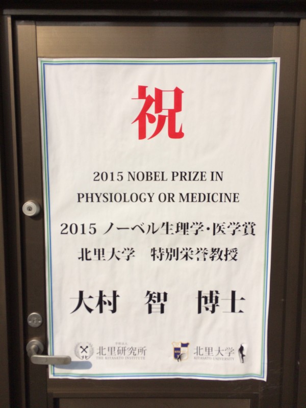 途中にあるのは北里大学。先日、ノーベル医学生理学賞を受賞した大村智博士が特別栄誉教授を務める大学だ。大学そのものは、垂れ幕を飾るでもなく、普段通りの雰囲気だったが、周囲の商店街が盛り上がっていた。街のあちこちに、ノーベル賞受賞を祝うポスターが貼られていた。